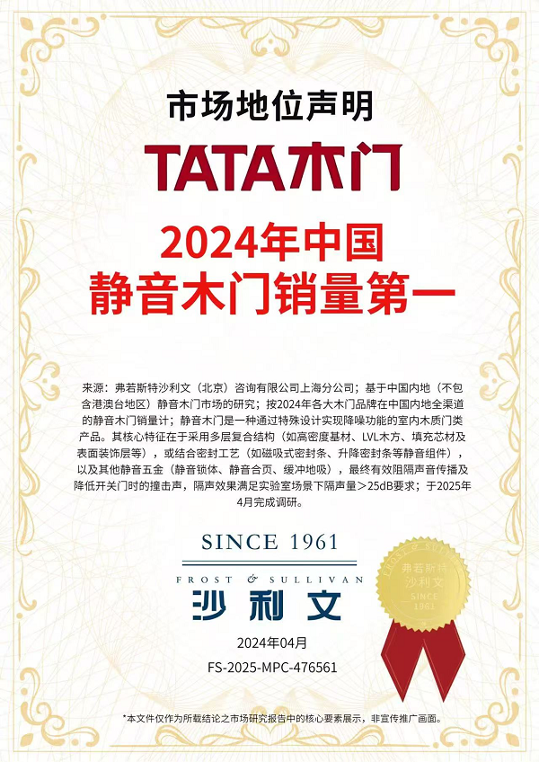 “静音大师”的市场爆发力,源于TATA木门对静音技术的深耕。自2012年首创45°斜口软磁吸技术以来,品牌斩获190余项专利,先后推出多款静音产品迭代升级。2024年,TATA木门获沙利文认证“中国静音木门销量第一”,市场占有率连续8年位居行业前列,形成了技术研发、供应链整合、用户洞察的全链条优势。