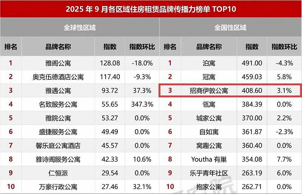 迈点研究院“2025年9月全国性区域住房租赁品牌传播力榜单TOP10”TOP3