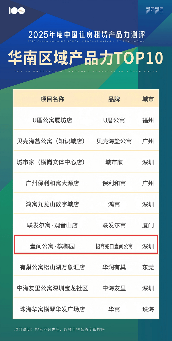 招商蛇口壹间·槟榔园入选克而瑞“2025年度中国住房租赁产品力测评华南区域产品力TOP10”榜单
