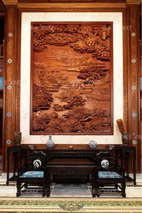 卓木王董事长、中国传统工艺大师杜承三亲自操刀设计多处木雕作品,以浮雕、圆雕、透雕等技法,赋予每一处细节丰富的文化寓意与极高的艺术价值。华堂中央缅甸花梨木雕《千里江山》屏风尤为夺目,寿桃累累、仙鹤翩跹,云纹流转如瀑,将“寿比南山”“松鹤延年”的美好寓意,深深镌刻进每一寸木肌理,尽显匠心与神韵。