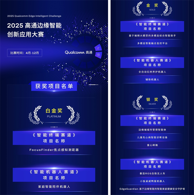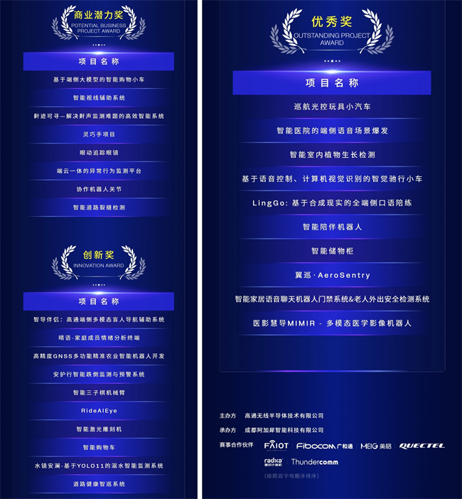 本届大赛由高通无线半导体技术有限公司主办,阿加犀承办,广翼智联、广和通、美格智能、移远通信、瑞莎、创通联达作为赛事合作伙伴共同参与。赛事聚焦边缘智能技术创新与应用落地,致力于为开发者打造集创意展示、技术实践与产业协作于一体的开放平台。经过初赛、复赛层层选拔与严格评审,最终共有40个优秀项目从“智能机器人”与“智能终端”两大赛道、近千份参赛作品中脱颖而出。
