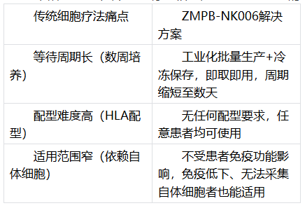 与自体CAR-T、传统NK疗法相比,ZMPB-NK006的“现货属性”实现了革命性突破,精准解决传统治疗的核心难题:
