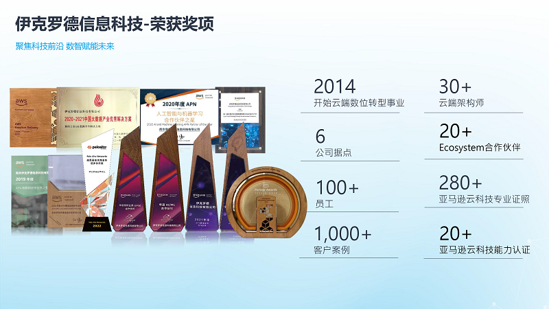 随着2020年前后机器学习和AI浪潮的兴起,客户的需求从“使用云”转向了“用AI解决业务痛点”。伊克罗德信息敏锐地把握住转型机遇,成为客户新技术的“引路人”。那一刻起,伊克罗德信息成为第一批投入Amazon SageMaker和机器学习认证的合作伙伴。当2023年生成式AI爆发时,也积极取得生成式AI能力认证,成为首批的AI合作伙伴,伊克罗德信息没有选择激进地“All-in”,而是选择了一条更务实、更符合其服务基因的道路——通过持续迭代推进创新。