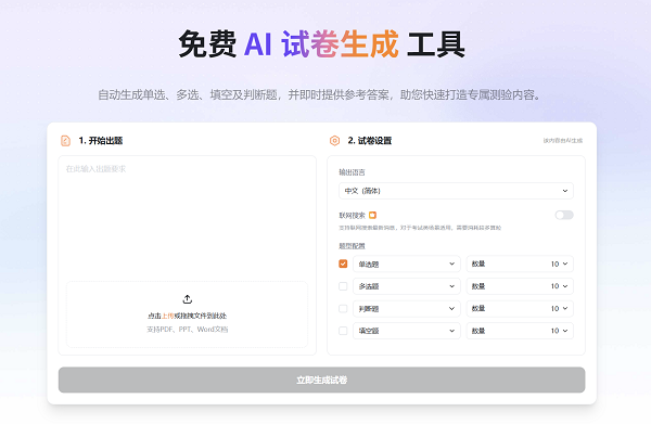 该功能基于先进的大语言模型技术,能够精准理解用户输入的文本或话题,一键生成包含多种题型的定制化试卷,为教师、企业培训师及个人学习者提供了一种颠覆性的出题解决方案。