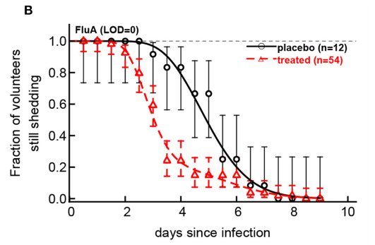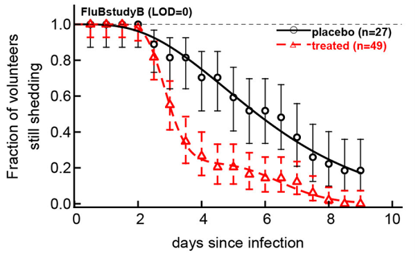上图表示每个测量时间点上仍在排毒的乙流感染者比例,红色线条是服用奥司他韦的患者,黑色线条是服用安慰剂的患者,可见,与服用安慰剂相比,服用奥司他韦2天之后,仍在排出乙流病毒的患者比例就已经显著降低,并持续至第9天。