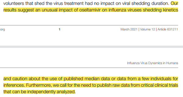 并且该研究指出“我们的结果提示奥司他韦对流感病毒脱落动力学具有异常影响,并提醒人们谨慎使用已发表的中位数数据或少数个体的数据进行推断。此外,我们呼吁公布关键临床试验的原始数据,以便进行独立分析。”