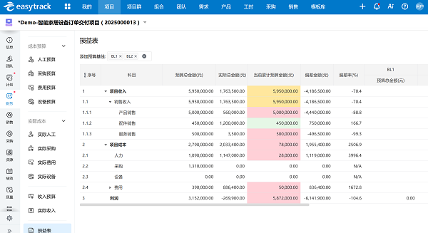 深度经营分析:系统如同一位专业的财务分析师,能够自动生成项目损益表,联动应收/应付信息,一旦利润偏差即触发预警,让管理者实时掌握盈利动态。