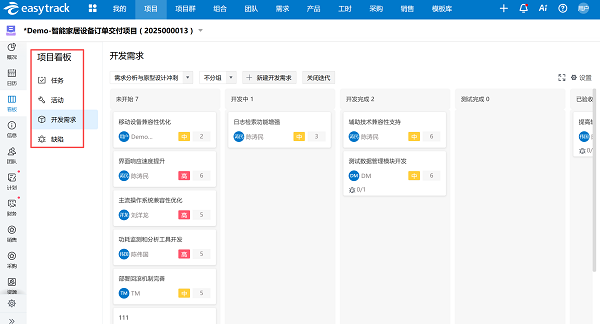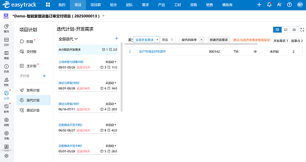 大部分企业往往同时存在敏捷研发与瀑布交付项目。EasyTrack 12.7.0打破模式壁垒,将开发模块与项目模块深度整合,不再区分“敏捷项目”和“瀑布项目”,实现“一套平台、多种模式”的统一管理。