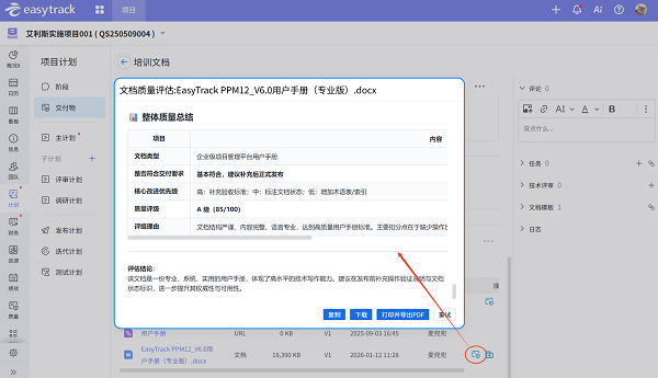 文档质量评估:对交付物附件(如需求规格说明、会议纪要)进行多维度自动化质量扫描,生成简明摘要与评分,帮助团队快速把控文档质量。