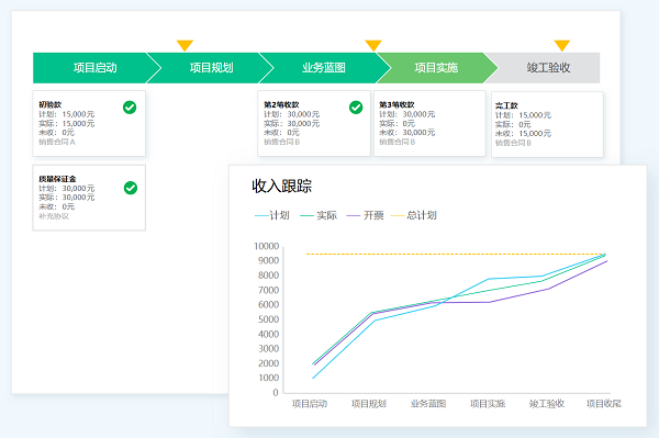 合同与执行一体化:销售合同可直接关联项目,交付进度与收付款计划联动,打通从销售到交付的数据流,保障回款。