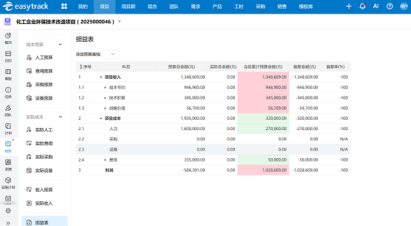 项目利润实时监控:通过成本预算和基于工时单、费用单的实际成本自动归集,实时生成项目损益表,对利润偏差进行红黄绿灯预警,及时纠偏。